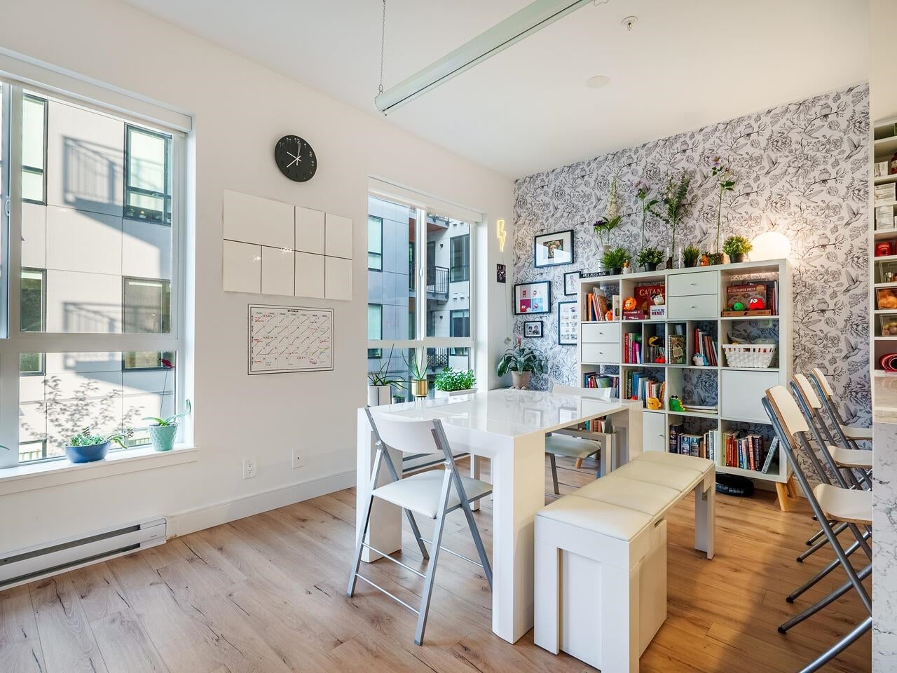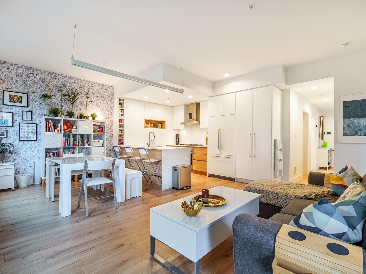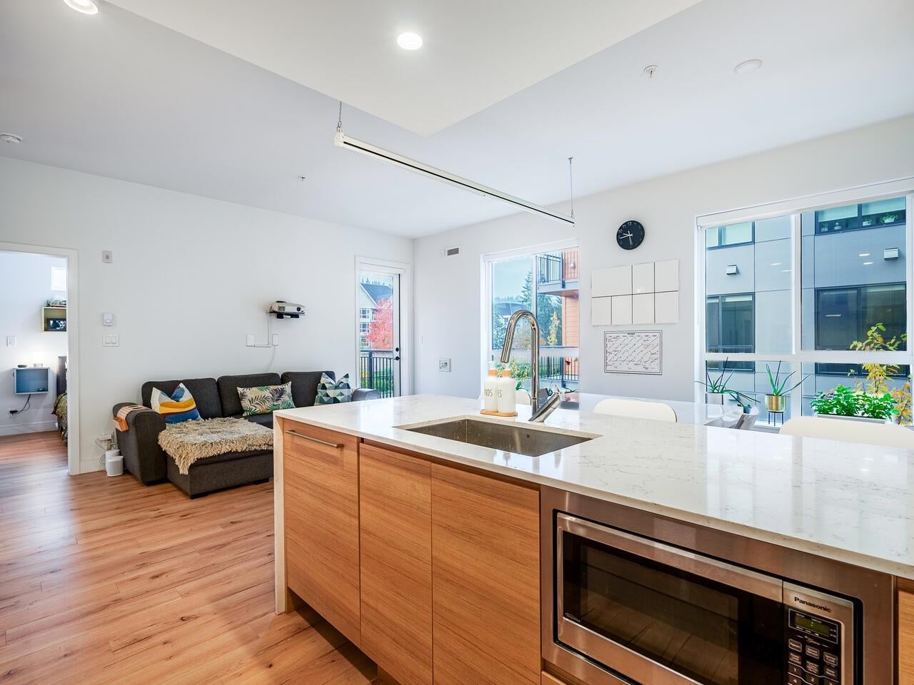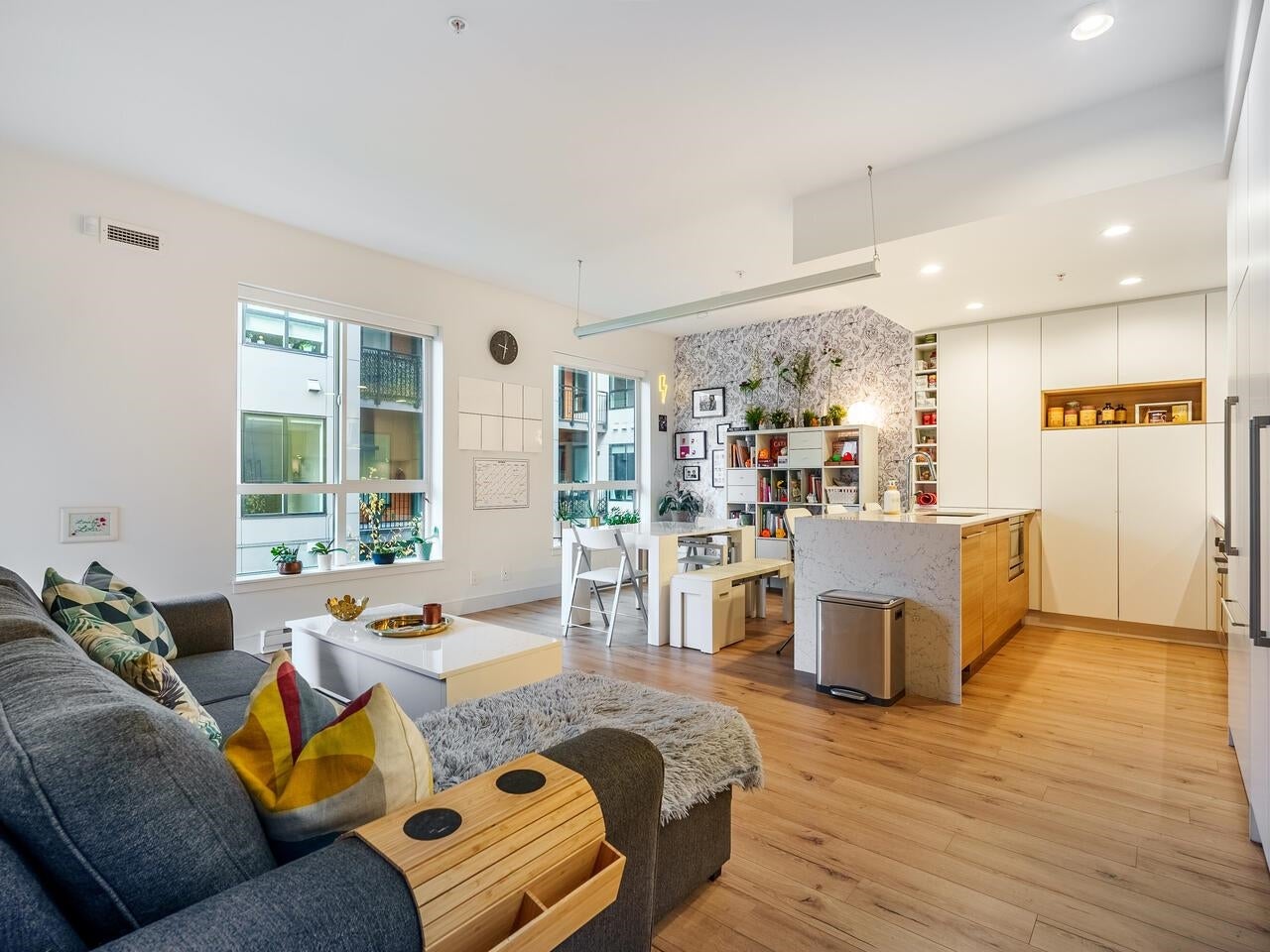 This 2 BED +DEN CORNER UNIT has it all! Enjoy open concept living, 9ft ceilings, & plank style flooring throughout. Kitchen w/ high-end integrated appliances, gas range, electric stove, loads of cabinets, pantry & quartz waterfall countertops. Enjoy relaxing on your SW facing deck. Primary bedroom w/ lots of built-in storage/ drawers & spa-like ~best describes the 5 pc ensuite w/ stylish hexagon porcelain tile flooring & stone counters. Ownership offers exclusive use to CLUB 50- over 9000 Sq Ft of AMAZING amenities ; media, yoga & co - work areas, state of the art fitness centre- kid/ play area, dog wash & guest suite +LOCATION- stroll to skytrain, WCE, trendy shops, restaurants & breweries.Open House Sat, Sept 27th, 2-4pm